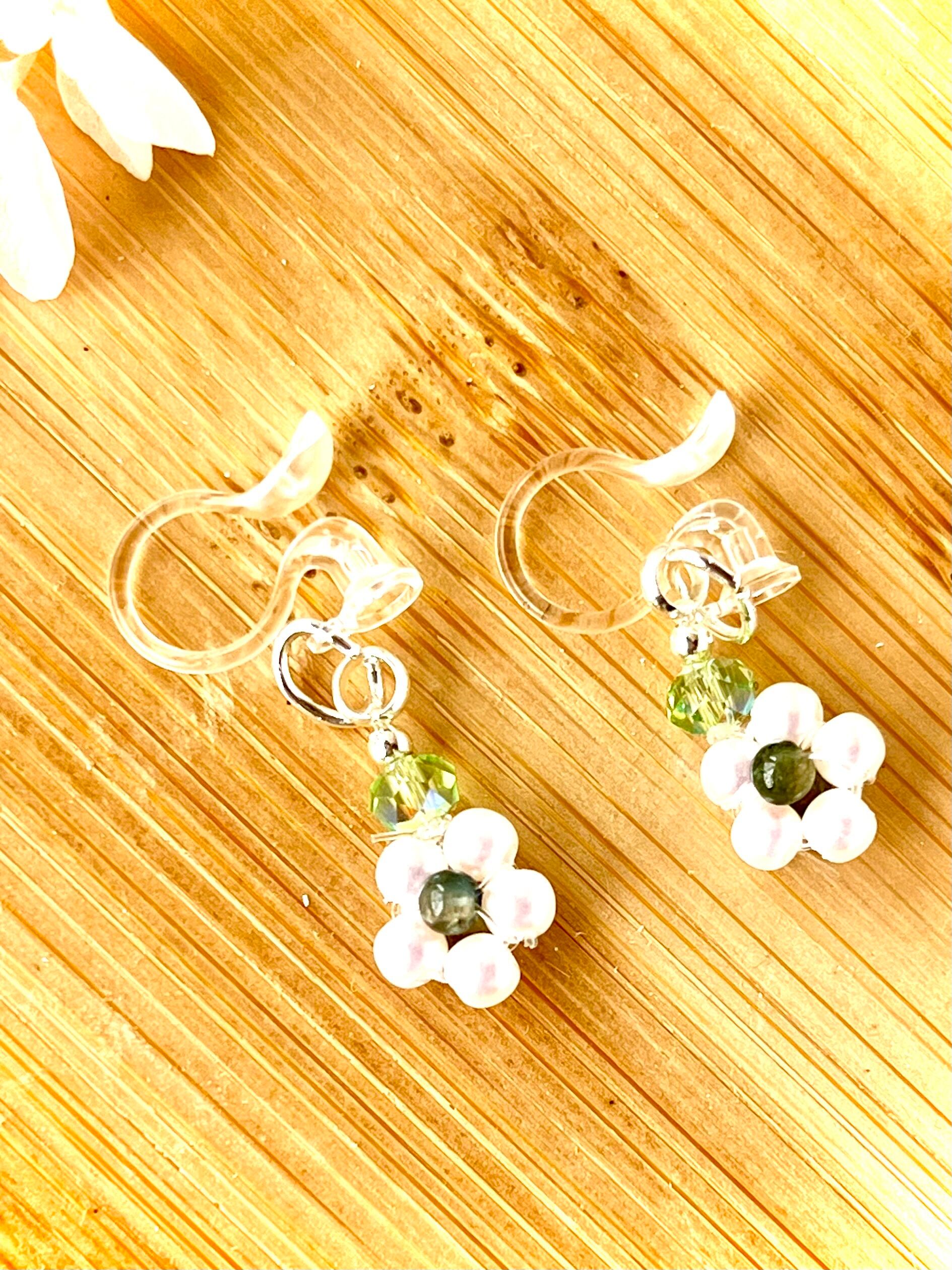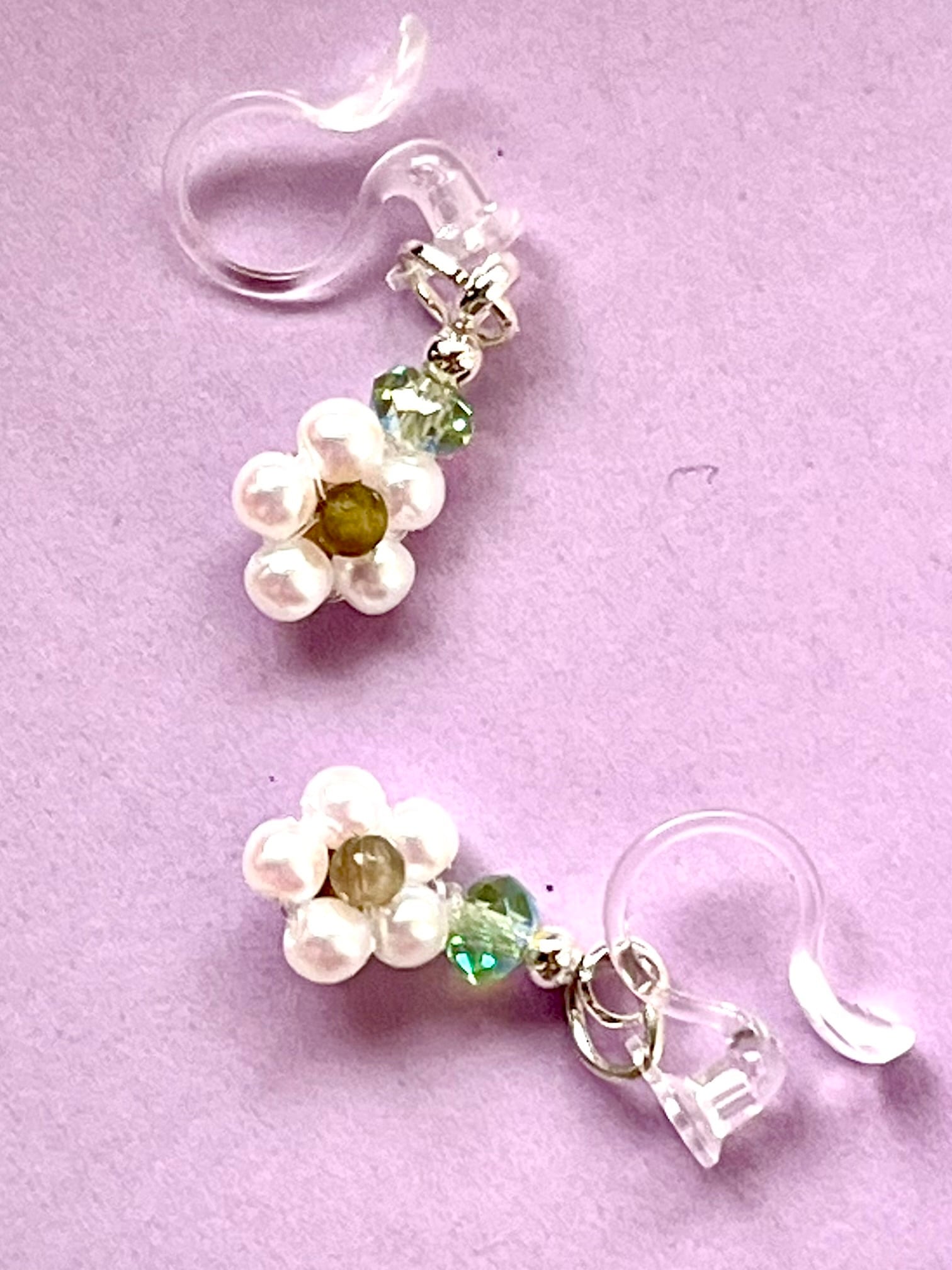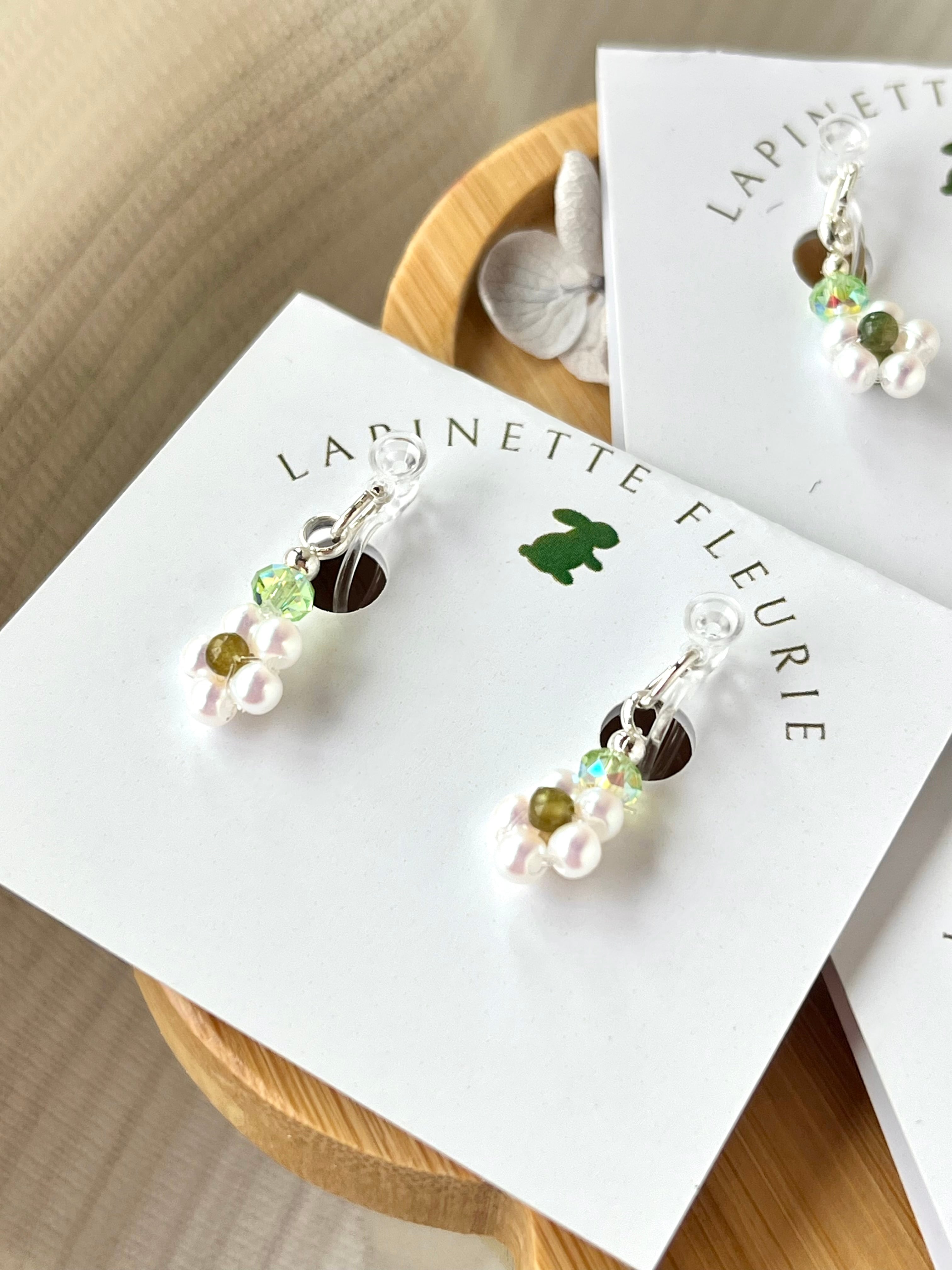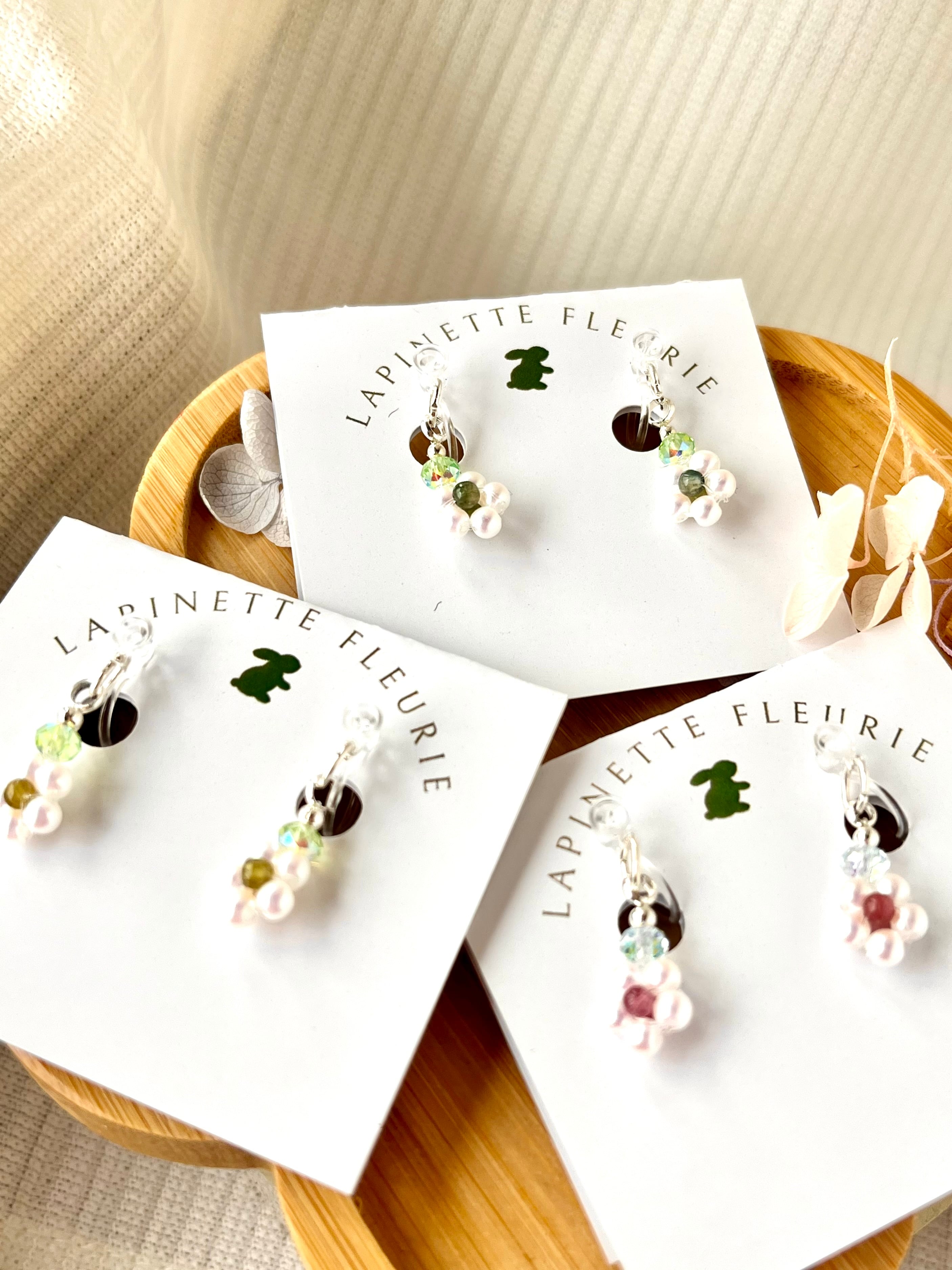 3mmのパールビーズと碧玺(トルマリン)を編み込み、小さく可憐なお花モチーフに仕立てました。シンプルだからこそ、素材の透明感とやさしい色合いが引き立ちます。