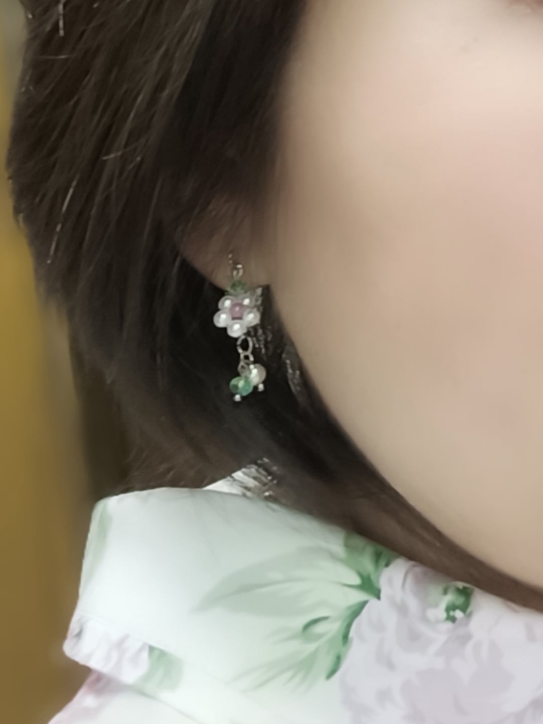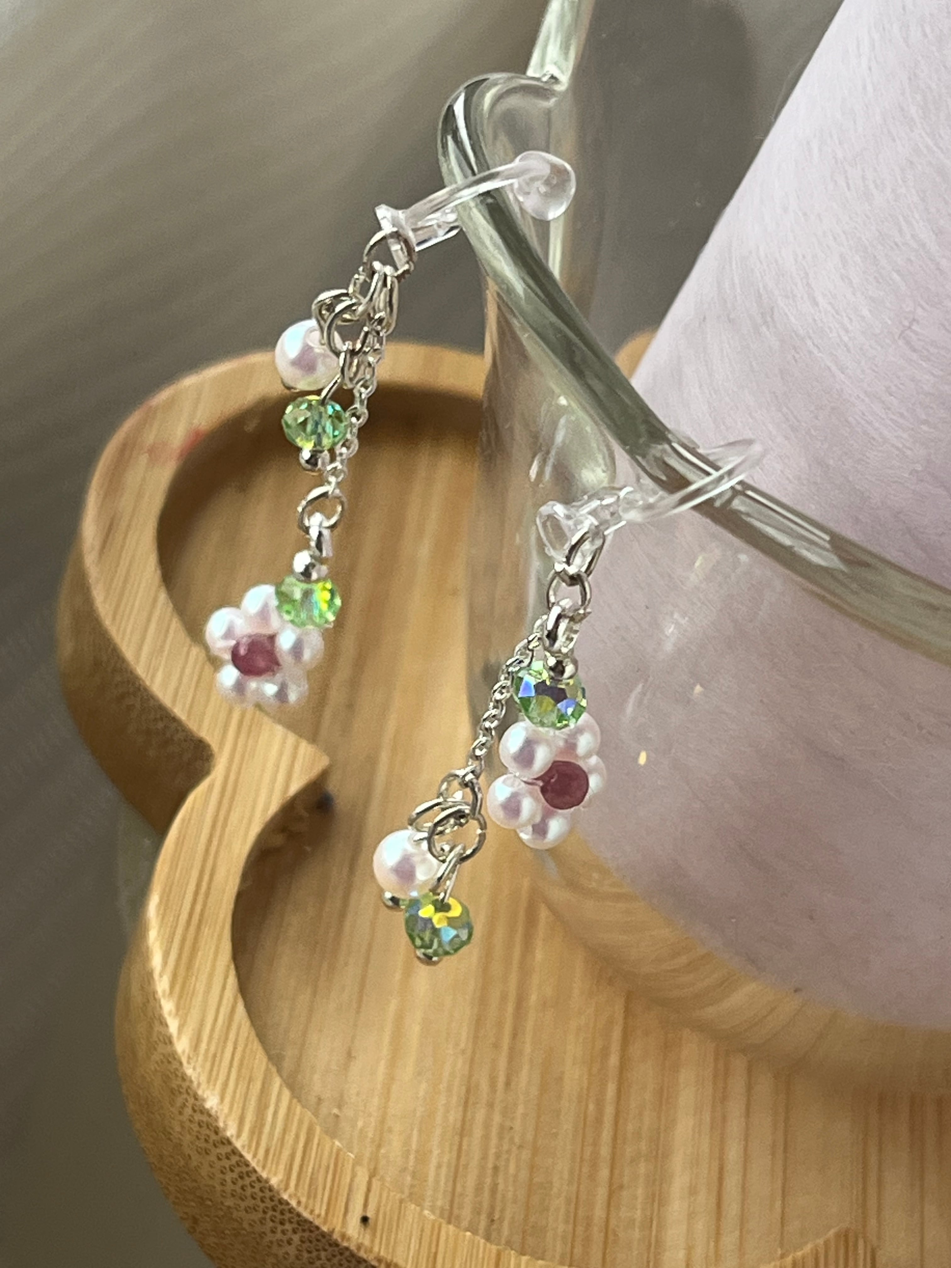 3mmのパールビーズと碧玺(トルマリン)を丁寧に編み込み、繊細なお花モチーフに仕上げました。ほんのり色づく天然石が、やさしく華やかさを添えます。